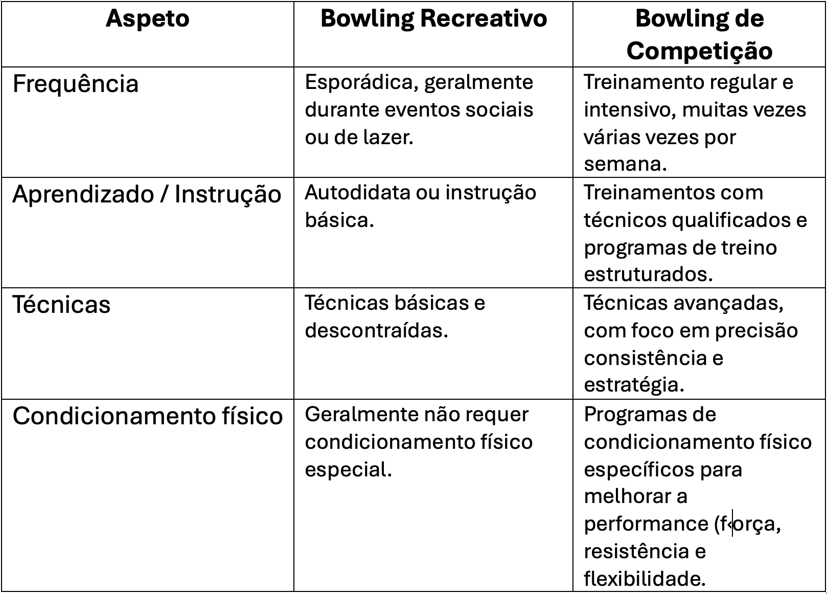 Existem 2 tipos de bowling que têm diferenças importantes, no tocante aos requerimentos exigidos aos praticantes da modalidade: o bowling recreativo e o bowling de competição.